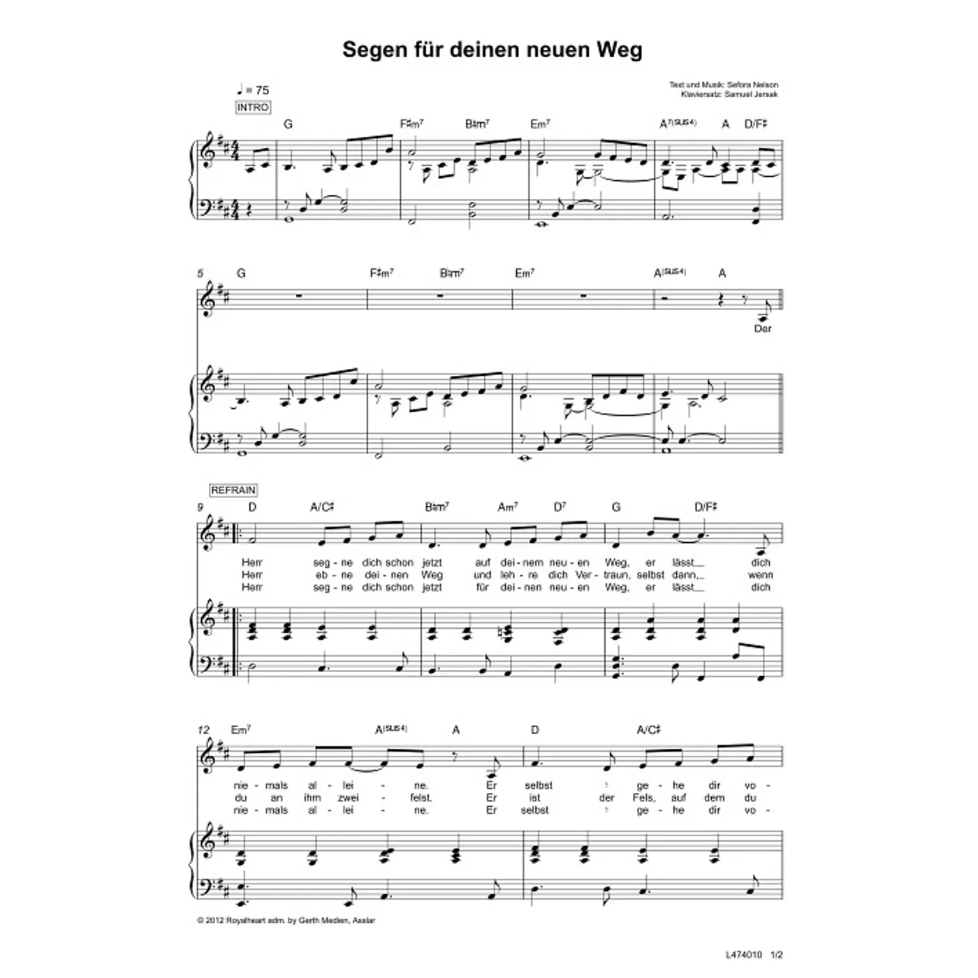 Segen für deinen neuen Weg (diese Variante haben Sie gerade ausgewählt) (modern, Klavier, einstimmig, mit Akkorden, D-Dur) Sefora Nelson (Komposition, Text), Samuel Jersak (Klaviersatz) |