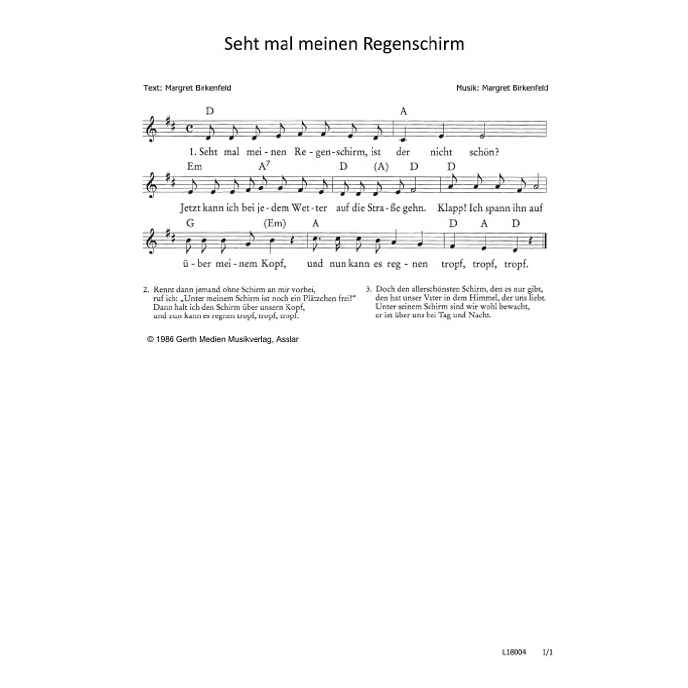 Seht mal meinen Regenschirm (diese Variante haben Sie gerade ausgewählt) (einstimmig, mit Akkorden, D-Dur) Margret Birkenfeld (Komposition, Text) |