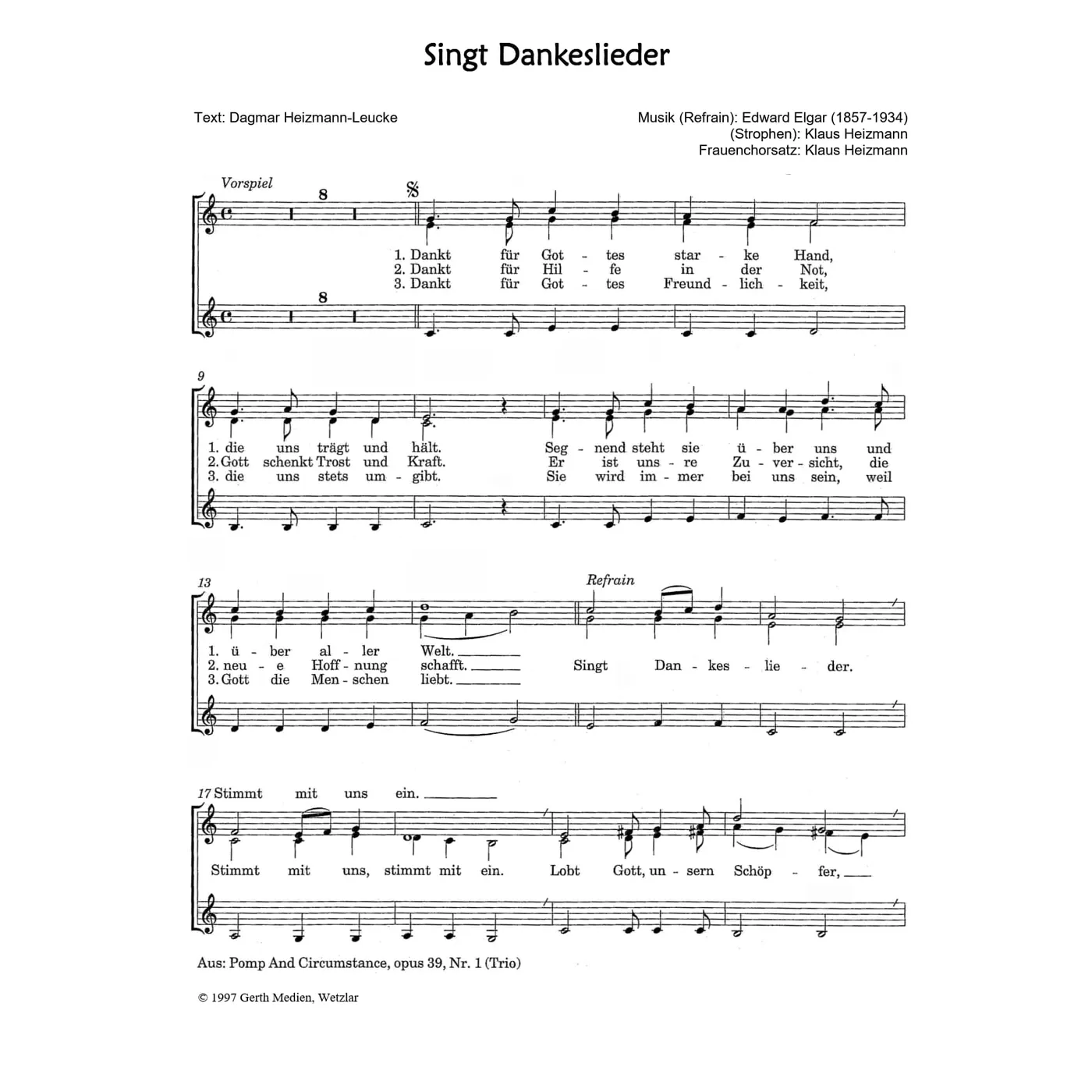 Singt Dankeslieder (diese Variante haben Sie gerade ausgewählt) (Worship, Frauenchor, dreistimmig) Edward Elgar (Melodie), Klaus Heizmann (Melodie, Satz), Dagmar Heizmann-Leucke (Text) |