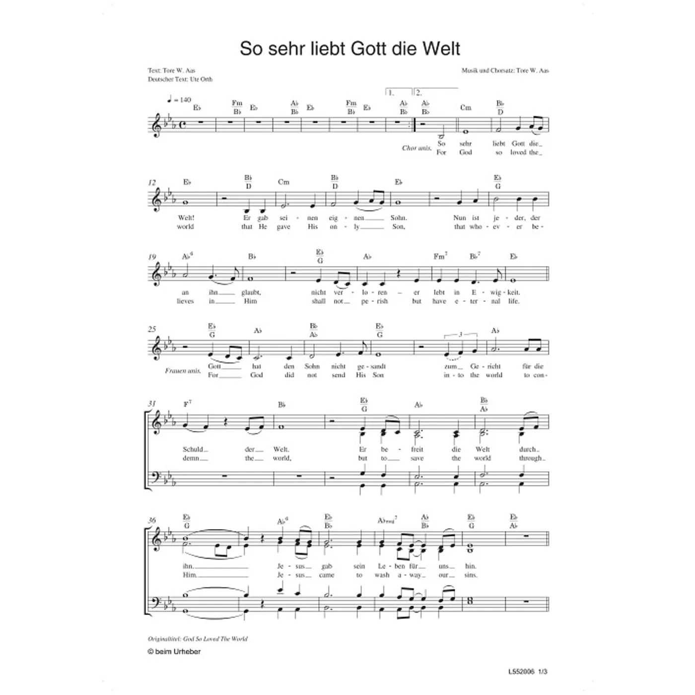 Dies ist ein Download-Artikel und kann nach dem Kauf digital heruntergeladen werden. Vorschau Tore W. Aas (Komposition, Text, Chorsatz) Ute Orth (Übersetzung) So sehr liebt Gott die Welt Gemischter Chor SATB / Solo (Noten - Download) Bitte beachten Sie: Downloads sind aktuell nur in Deutschland erhältlich. Bitte wählen Sie aus, für wie viele Kopien/Ausdrucke Sie eine Lizenz erwerben möchten. Die Lizenz wird entsprechend auf dem Dokument vermerkt. 2,00 € Sofort Lieferbar (per Download) Günstige Mengenpreise verfügbar Günstige Mengenpreise (DE) Kaufen Sie 2 zum Preis von je 1,90 € und sparen Sie 5% Kaufen Sie 10 zum Preis von je 1,80 € und sparen Sie 10% Kaufen Sie 25 zum Preis von je 1,70 € und sparen Sie 15% Kaufen Sie 50 zum Preis von je 1,60 € und sparen Sie 20% Kaufen Sie 100 zum Preis von je 1,50 € und sparen Sie 25% Lizenz pro Kopie/Ausdruck: Bestellen Sie den Artikel jetzt auf: Informationen zur Lizenz Details Verlag: Small Stone Media Artikel-Nr.: W80034137 Originaltitel: God So Loved The World Tonart: Es-Dur Satz: gemischter Chor, mit Akkorden, Solostimme, vierstimmig Seitenzahl: 3 S. Hinweise: DIN A4 Dateigröße insg.: 122,0 Kilobyte Dieses Produkt ist preisgebunden: Ja Download-Material: L552006 (PDF) Angaben zum Hersteller nach GPSR: Gerth Medien i.d. SCM Verlagsgruppe GmbH Berliner Ring 62 35576 Wetzlar DEUTSCHLAND info@scm-verlagsgruppe.de Weitere Details Weitere Varianten Noten-Downloads So sehr liebt Gott die Welt (diese Variante haben Sie gerade ausgewählt) (Solostimme, gemischter Chor, mit Akkorden, vierstimmig, Es-Dur) Tore W. Aas (Komposition, Text, Chorsatz), Ute Orth (Übersetzung) Solostimme, gemischter Chor, mit Akkorden, vierstimmig, Es-Dur 2,00 € Die Preise stellen die Einzelpreise der jeweils verfügbaren Einzeldownloads dar. Bewertungen Für dieses Produkt gibt es noch keine Rezensionen. Weitere Artikel von Tore W. Aas zur Produktseite von Messiah - Das Musical (Bandpartitur) Messiah - Das Musical (Bandpartitur) Noten - Download 49,95 € Download zur Produktseite von Messiah - Das Musical (Libretto dt. Text/digital) Messiah - Das Musical (Libretto dt. Text/digital) Noten - Download 19,80 € Download zur Produktseite von Messiah - Das Musical (Chorpartitur) Messiah - Das Musical (Chorpartitur) Noten - Download 19,80 € Download zur Produktseite von Messiah - Das Musical (Orchesterpartitur) Messiah - Das Musical (Orchesterpartitur) Noten - Download 60,00 € Download zur Produktseite von The Lord Is My Light The Lord Is My Light Noten - Download 2,50 € Download zur Produktseite von On The Cross Of Calvary On The Cross Of Calvary Noten - Download 2,00 € Download zur Produktseite von This is the Lord's doing This is the Lord's doing Noten - Download 2,00 € Download zur Produktseite von Holy Is The Lamb Holy Is The Lamb Noten - Download 1,50 € Download zur Produktseite von Licht im Dunkel Licht im Dunkel Noten - Download 2,00 € Download zur Produktseite von Celebrate Celebrate Noten - Download 2,00 € Download zur Produktseite von His Name Will Shine His Name Will Shine Noten - Download 2,00 € Download zur Produktseite von Halleluja! Christ Is Risen Halleluja! Christ Is Risen Noten - Download 2,50 € Download Alle Artikel von Tore W. Aas anzeigen Das könnte Sie auch interessieren zur Produktseite von Wohin sonst Wohin sonst Noten - Download 1,50 € Download zur Produktseite von All unsre Tränen All unsre Tränen Noten - Download 2,80 € Download zur Produktseite von Im Himmel gibt es manches Im Himmel gibt es manches Noten - Download 1,50 € Download zur Produktseite von Am Kreuz ist Raum für dich Am Kreuz ist Raum für dich Noten - Download 1,50 € Download zur Produktseite von In Your Arms In Your Arms Noten - Download 1,50 € Download zur Produktseite von You Are Holy You Are Holy Noten - Download 2,00 € Download zur Produktseite von Unter seinen Feinden Unter seinen Feinden Noten - Download 1,50 € Download zur Produktseite von Am Kreuz ist Raum für dich Am Kreuz ist Raum für dich Noten - Download 1,50 € Download zur Produktseite von Bless The Lord Bless The Lord Noten - Download 2,00 € Download