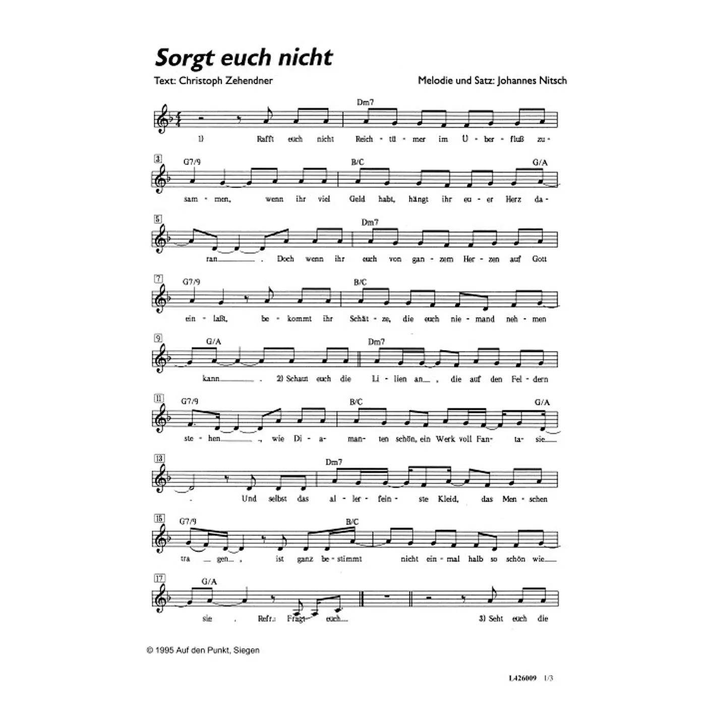 Sorgt euch nicht (modern, Klavier, dreistimmig, gemischter Chor, mit Akkorden, D-Moll) Johannes Nitsch (Komposition, Chorsatz), Christoph Zehendner (Text), Manfred Staiger (Klaviersatz) | modern, Klavier, dreistimmig, gemischter Chor, mit Akkorden, D-Moll | 4,80 € |
