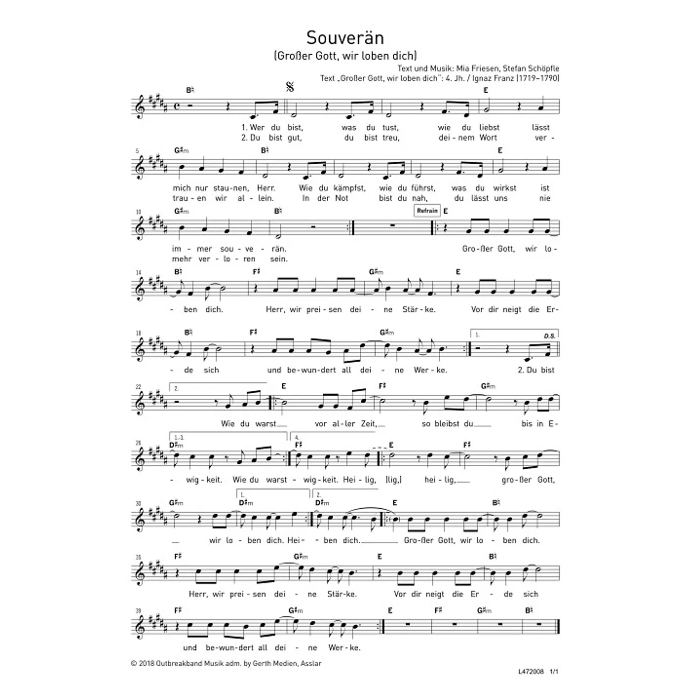 Dies ist ein Download-Artikel und kann nach dem Kauf digital heruntergeladen werden. Vorschau Mia Friesen (Komposition, Text) Stefan Schöpfle (Komposition, Text) Souverän einstimmig mit Akkorden | Originaltonart (Noten - Download) Bitte beachten Sie: Downloads sind aktuell nur in Deutschland erhältlich. Bitte wählen Sie aus, für wie viele Kopien/Ausdrucke Sie eine Lizenz erwerben möchten. Die Lizenz wird entsprechend auf dem Dokument vermerkt. 1,50 € Sofort Lieferbar (per Download) Günstige Mengenpreise verfügbar Günstige Mengenpreise (DE) Kaufen Sie 2 zum Preis von je 1,43 € und sparen Sie 5% Kaufen Sie 10 zum Preis von je 1,35 € und sparen Sie 10% Kaufen Sie 25 zum Preis von je 1,28 € und sparen Sie 15% Kaufen Sie 50 zum Preis von je 1,20 € und sparen Sie 20% Kaufen Sie 100 zum Preis von je 1,13 € und sparen Sie 25% Lizenz pro Kopie/Ausdruck: Bestellen Sie den Artikel jetzt auf: Informationen zur Lizenz Details Erscheinungstermin: 01.02.2018 Verlag: Outbreakband Musik Artikel-Nr.: W80033331 Tonart: h-Dur Stil/Genre: Gemeindelied Satz: einstimmig, mit Akkorden Seitenzahl: 1 S. Hinweise: DIN A4 Dateigröße insg.: 63,0 Kilobyte Dieses Produkt ist preisgebunden: Ja Download-Material: L472008 (PDF) Angaben zum Hersteller nach GPSR: Gerth Medien i.d. SCM Verlagsgruppe GmbH Berliner Ring 62 35576 Wetzlar DEUTSCHLAND info@scm-verlagsgruppe.de Weitere Details Weitere Varianten Noten-Downloads Souverän (diese Variante haben Sie gerade ausgewählt) (Gemeindelied, einstimmig, mit Akkorden, h-Dur) Mia Friesen (Komposition, Text), Stefan Schöpfle (Komposition, Text) Gemeindelied, einstimmig, mit Akkorden, h-Dur 1,50 € Die Preise stellen die Einzelpreise der jeweils verfügbaren Einzeldownloads dar. Bewertungen Für dieses Produkt gibt es noch keine Rezensionen. Weitere Artikel von Mia Friesen zur Produktseite von Ewigkeit Ewigkeit Noten - Download 1,50 € Download zur Produktseite von Ewigkeit Ewigkeit Noten - Download 10,80 € Download zur Produktseite von Weil du Jesus bist (Noten-Set) Weil du Jesus bist (Noten-Set) Noten - Download 5,50 € Download zur Produktseite von Mitten ins Herz (Noten-Set) Mitten ins Herz (Noten-Set) Noten - Download 7,50 € Download zur Produktseite von Oh am Kreuz Oh am Kreuz Noten - Download 1,50 € Download zur Produktseite von Ewigkeit Ewigkeit Noten - Download 1,50 € Download zur Produktseite von Die Liebe des Retters Die Liebe des Retters Noten - Download 1,50 € Download zur Produktseite von Sein Reich Sein Reich Noten - Download 1,50 € Download zur Produktseite von Zuerst geliebt Zuerst geliebt Noten - Download 3,80 € Download zur Produktseite von Die Liebe des Retters Die Liebe des Retters Noten - Download 3,80 € Download zur Produktseite von Die Liebe des Retters Die Liebe des Retters Noten - Download 1,50 € Download zur Produktseite von Wir sind eins Wir sind eins Noten - Download 1,50 € Download Alle Artikel von Mia Friesen anzeigen Das könnte Sie auch interessieren zur Produktseite von Atmosphäre Atmosphäre Noten - Download 1,50 € Download zur Produktseite von Frei in ihm Frei in ihm Noten - Download 1,50 € Download zur Produktseite von Atmosphäre Atmosphäre Noten - Download 1,50 € Download zur Produktseite von Atmosphäre Atmosphäre Noten - Download 1,50 € Download