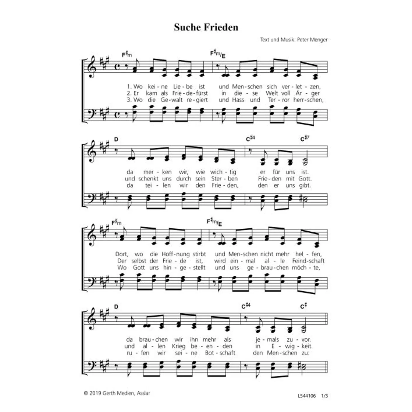 Suche Frieden (diese Variante haben Sie gerade ausgewählt) (Gemeindelied, modern, dreistimmig, gemischter Chor, mit Akkorden, fis-Moll) Peter Menger (Komposition, Text, Chorsatz) |