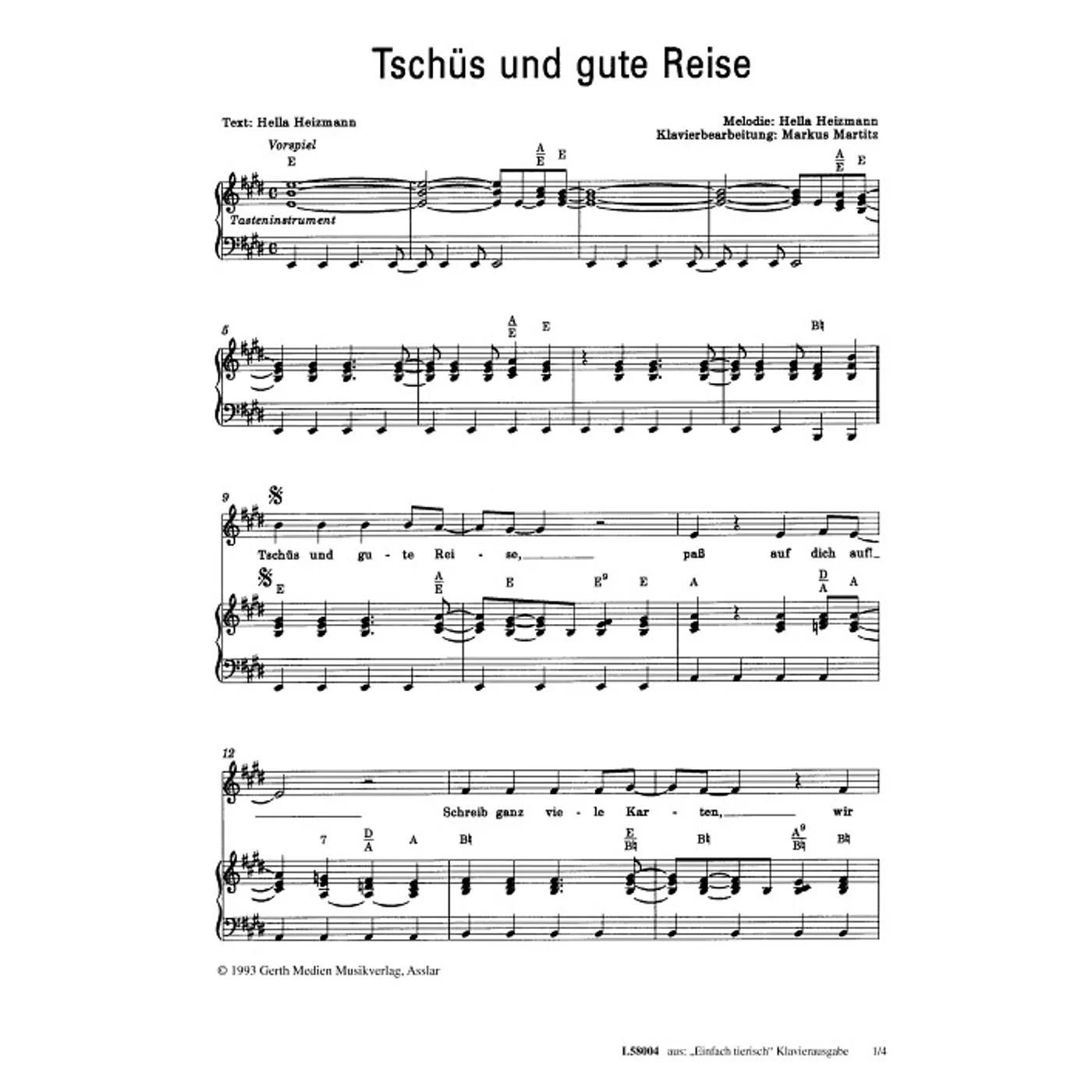Tschüs und gute Reise (diese Variante haben Sie gerade ausgewählt) (Klavier, einstimmig, mit Akkorden, E-Dur) Hella Heizmann (Komposition, Text), Markus Martitz (Klaviersatz) |