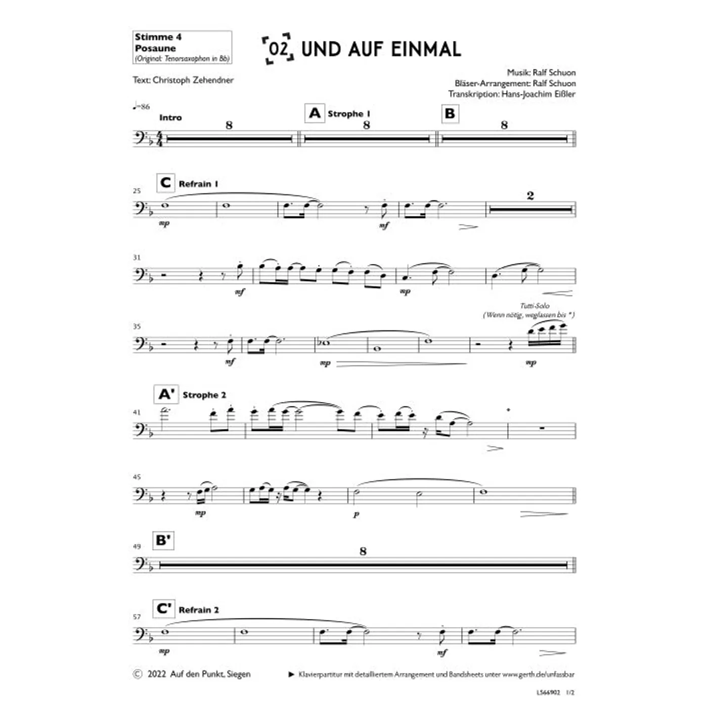 Und auf einmal (4. Posaune) (diese Variante haben Sie gerade ausgewählt) (Gemeindelied, Bläser, Orchestereinzelstimme, F-Dur) Christoph Zehendner (Text), Hans-Joachim Eißler (Bläsersatz), Ralf Schuon (Bläsersatz, Komposition) |