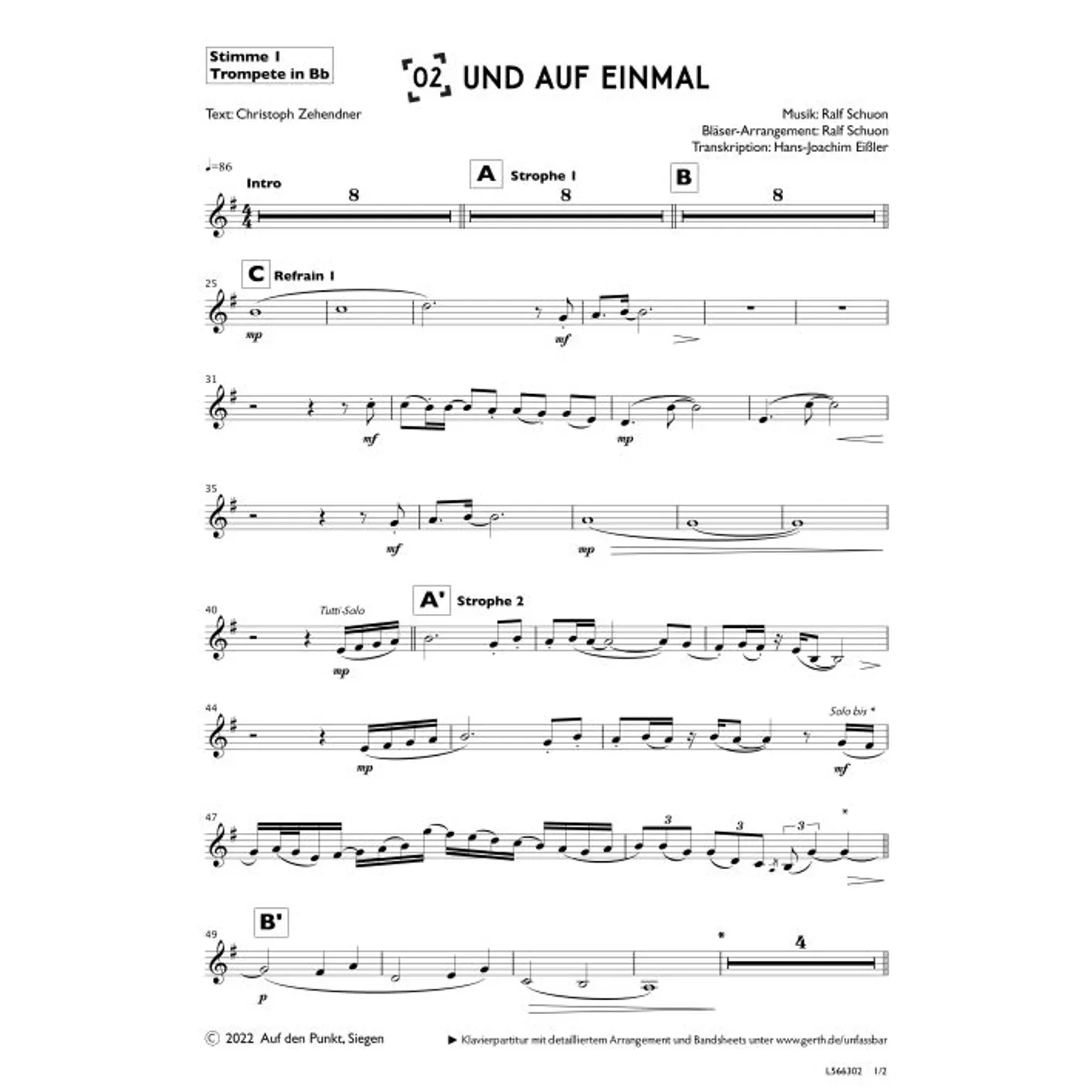 Und auf einmal (1. Trompete in Bb) (diese Variante haben Sie gerade ausgewählt) (Gemeindelied, Bläser, Orchestereinzelstimme, F-Dur) Christoph Zehendner (Text), Hans-Joachim Eißler (Bläsersatz), Ralf Schuon (Bläsersatz, Komposition) |