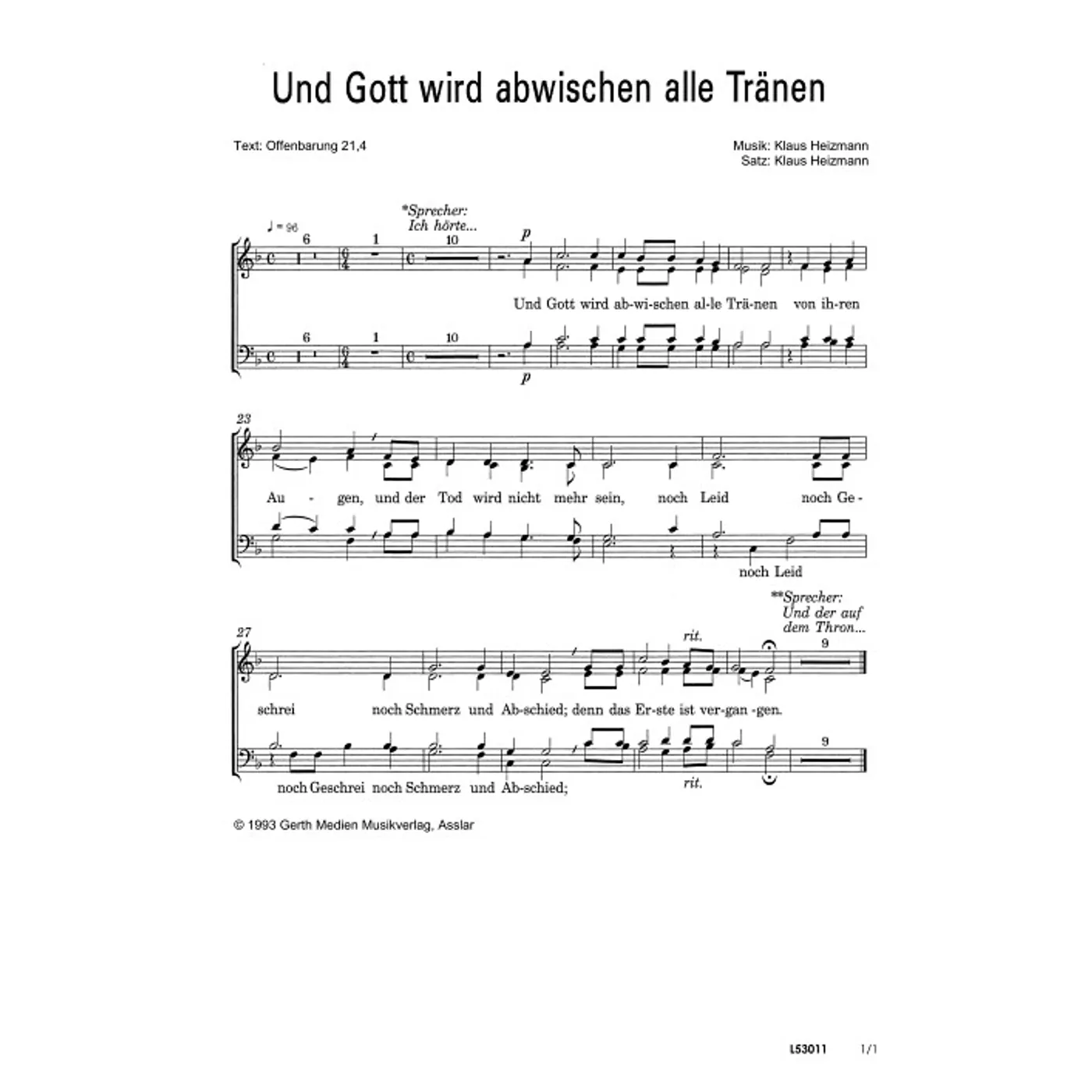 Und Gott wird abwischen alle Tränen (Kantate, traditionell, Solostimme, gemischter Chor, mit Akkorden, vierstimmig, C-Moll) Klaus Heizmann (Komposition, Bearbeiter) | Kantate, traditionell, Solostimme, gemischter Chor, mit Akkorden, vierstimmig, C-Moll | 1,50 € |