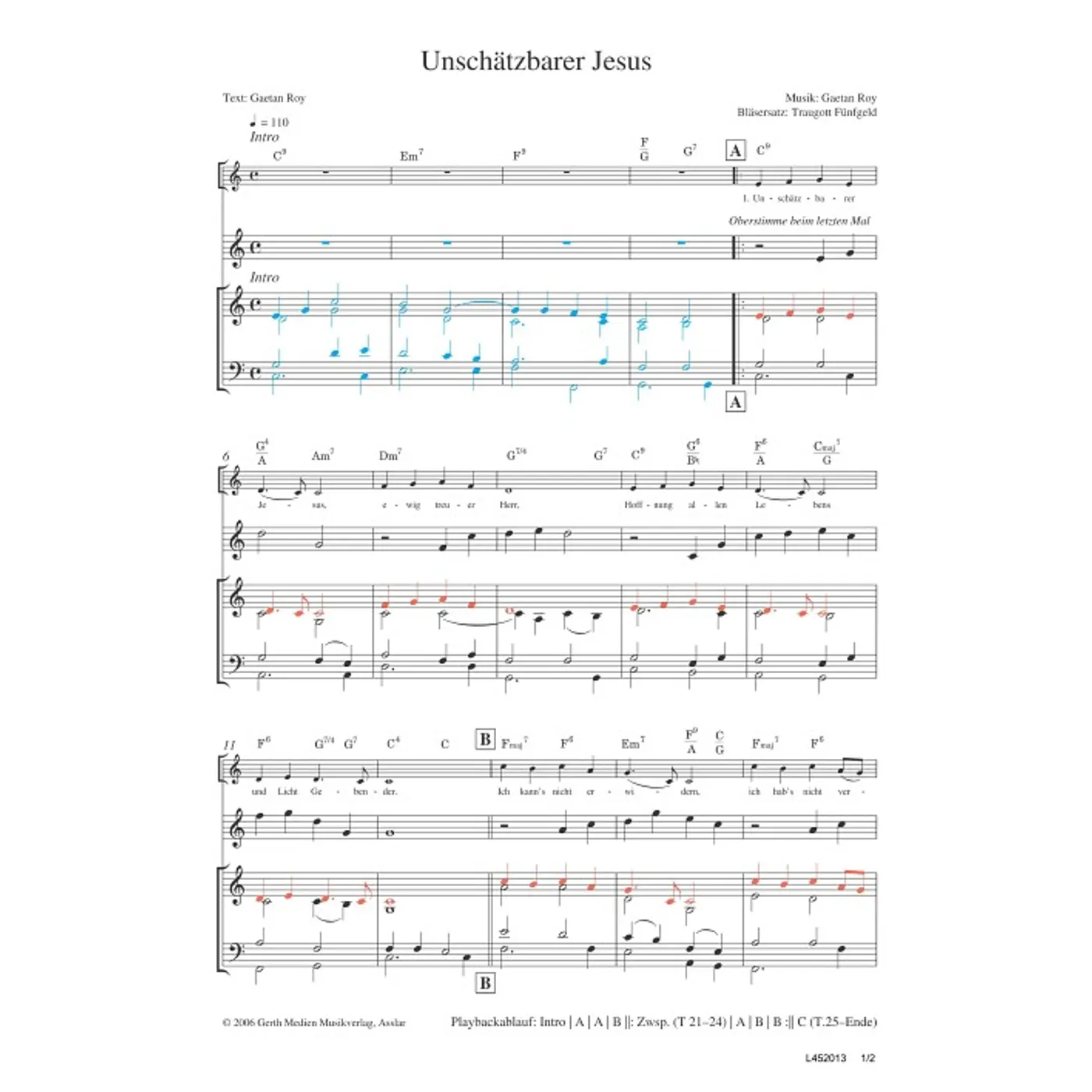 Unschätzbarer Jesus (Bläserpartitur, Partituren, dreistimmig, mit Akkorden, C-Dur) Gaetan Roy (Komposition, Text), Traugott Fünfgeld (Chorsatz) | Bläserpartitur, Partituren, dreistimmig, mit Akkorden, C-Dur | 1,50 € |
