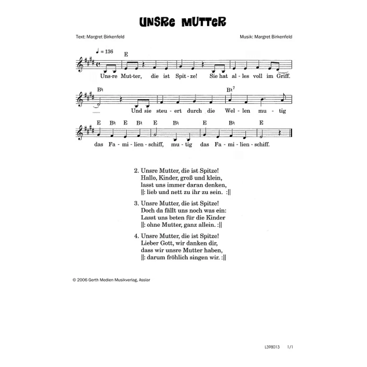 Unsre Mutter (diese Variante haben Sie gerade ausgewählt) (einstimmig, mit Akkorden, E-Dur) Margret Birkenfeld (Komposition, Text) |