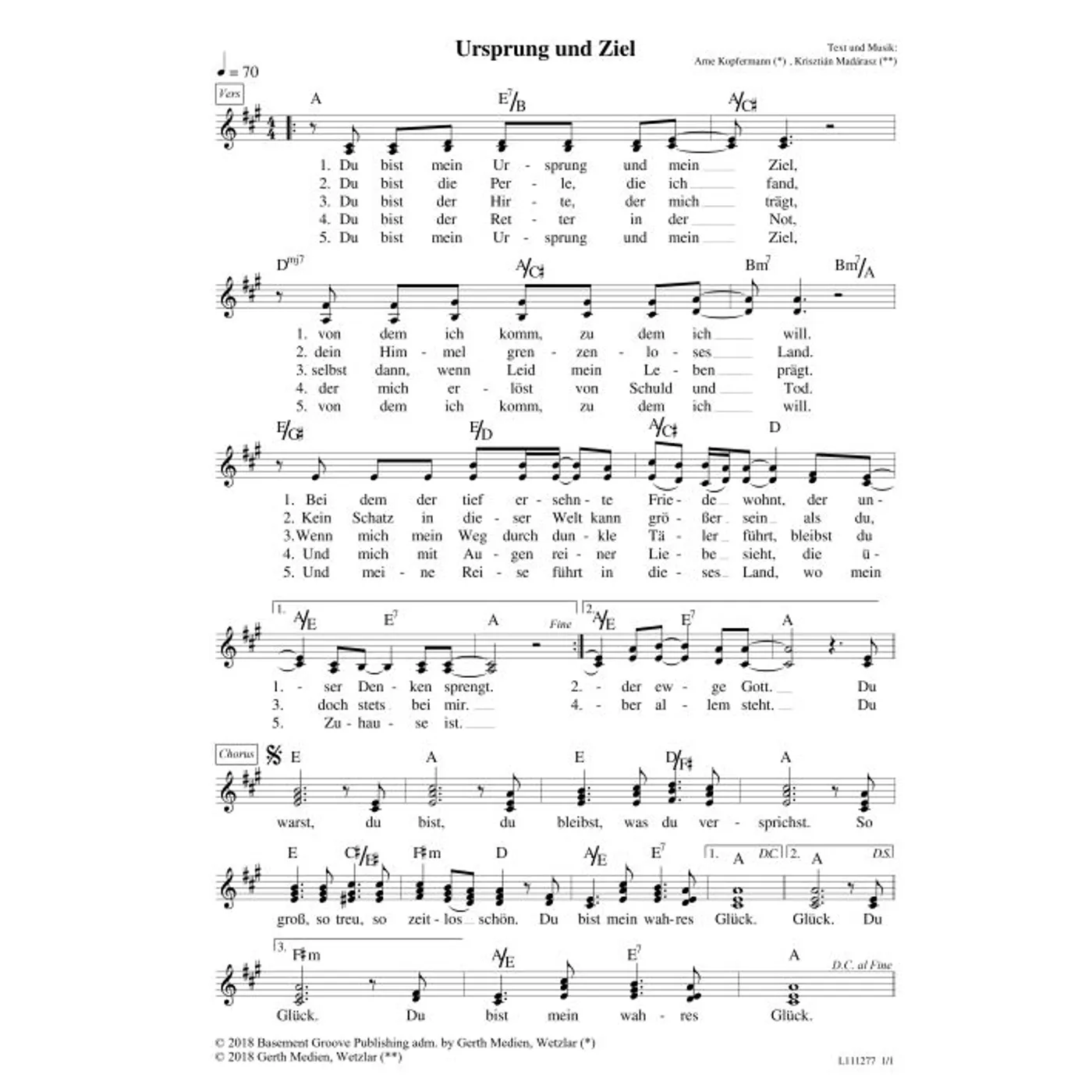 Ursprung und Ziel (diese Variante haben Sie gerade ausgewählt) (dreistimmig, mit Akkorden, A-Dur) Arne Kopfermann (Text), Kris Madarasz (Text) |
