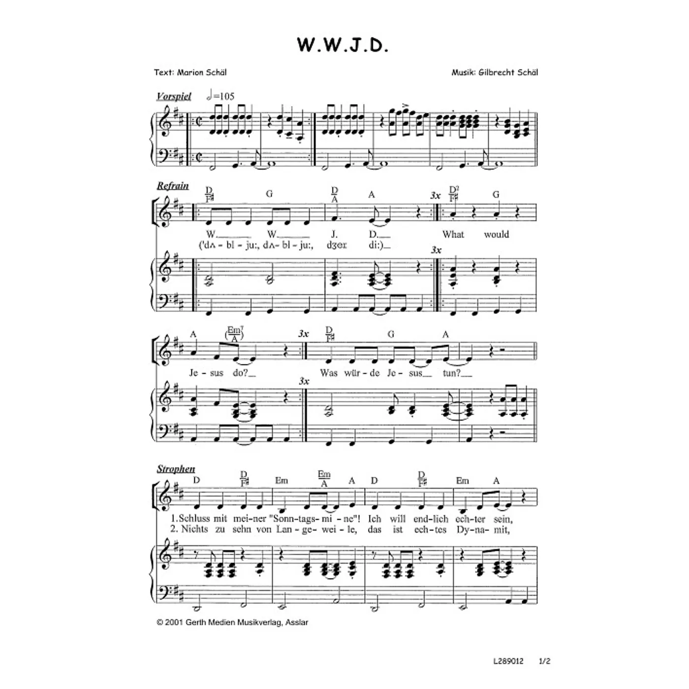 W.W.J.D. (einstimmig, mit Akkorden, D-Dur) Gilbrecht Schäl (Komposition), Marion Schäl (Text) | einstimmig, mit Akkorden, D-Dur | 1,50 € |
