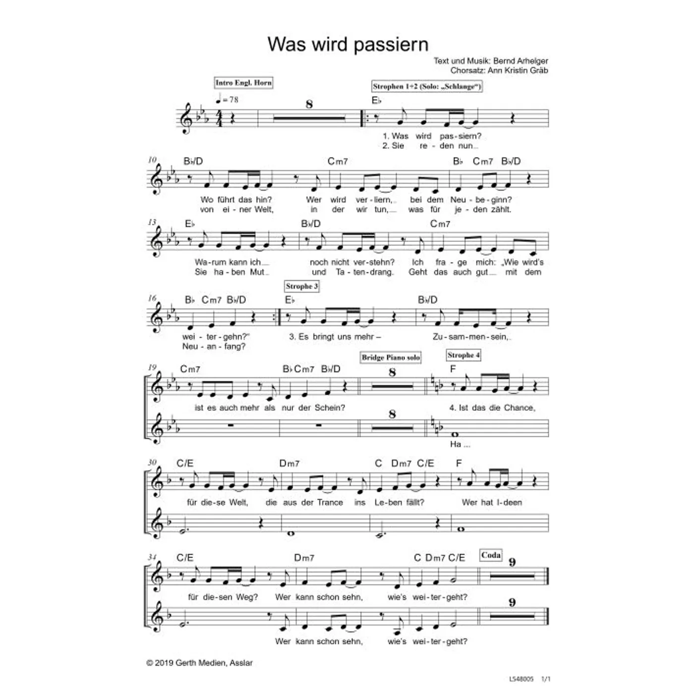 Was wird passiern (Kinderchor, Klavier, mit Akkorden, zweistimmig, Es-Dur, gleiche Reihe) Anni Gräb (Chorsatz), Bernd Arhelger (Klaviersatz) | Kinderchor, Klavier, mit Akkorden, zweistimmig, Es-Dur, gleiche Reihe | 3,80 € |