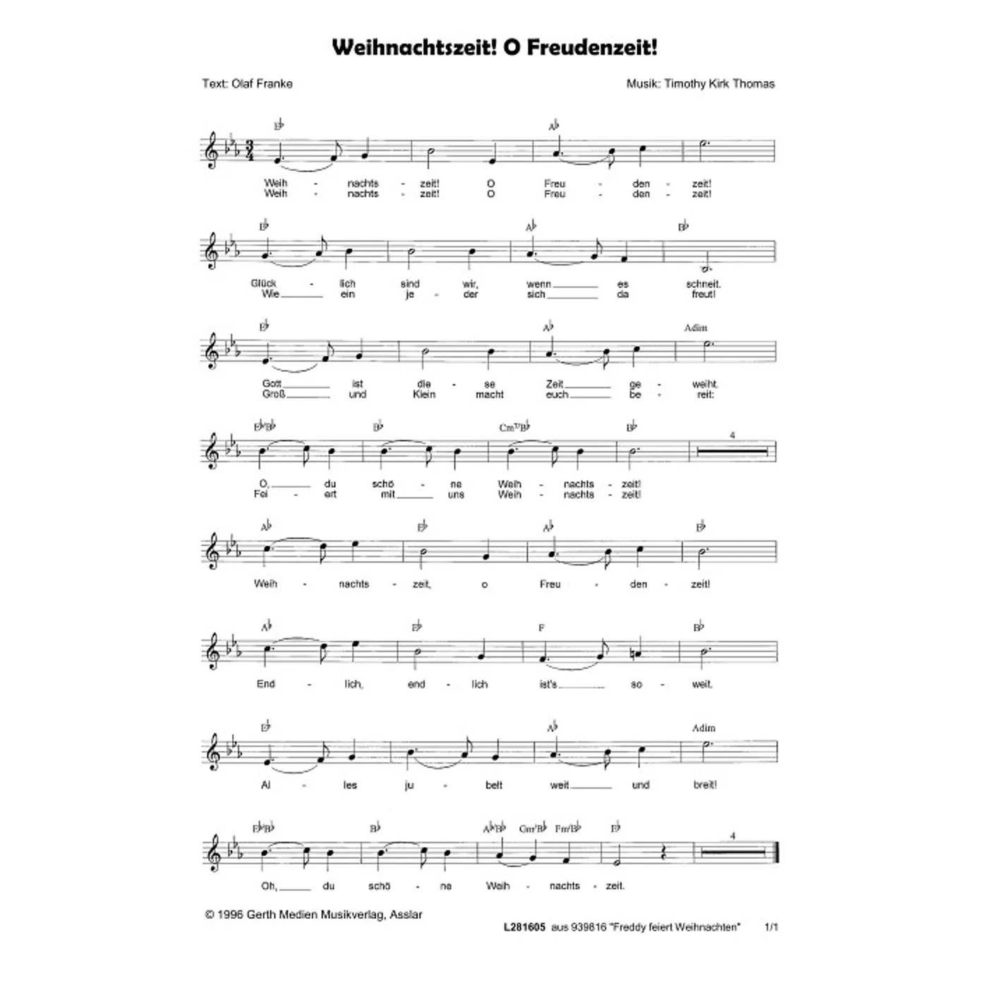 Weihnachtszeit! O Freudenzeit (diese Variante haben Sie gerade ausgewählt) (einstimmig, mit Akkorden, Es-Dur) Tim Thomas (Komposition), Olaf Franke (Text) |
