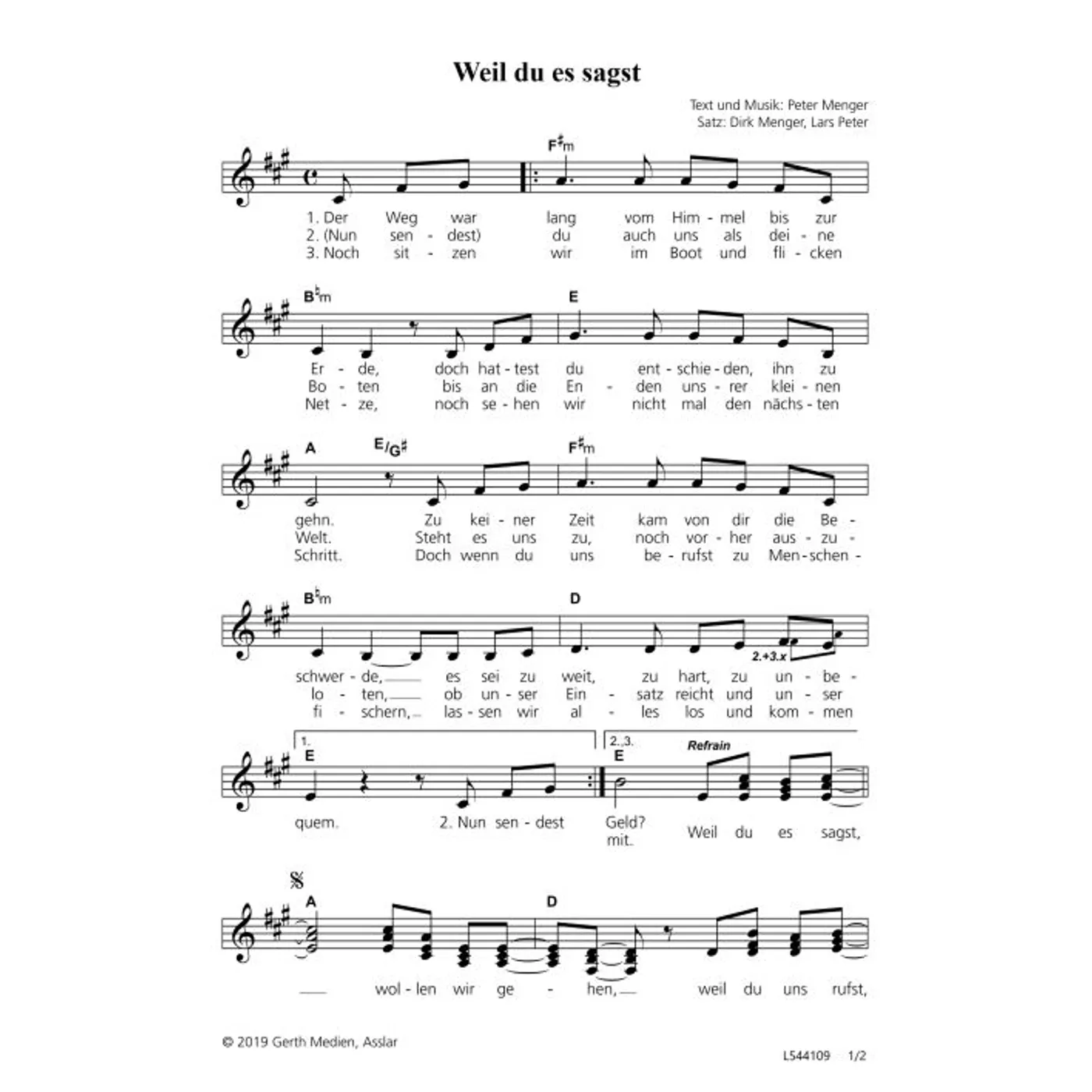 Weil du es sagst (diese Variante haben Sie gerade ausgewählt) (Gemeindelied, modern, dreistimmig, mit Akkorden, fis-Moll) Dirk Menger (Chorsatz), Peter Menger (Komposition, Text), Lars Peter (Chorsatz) |