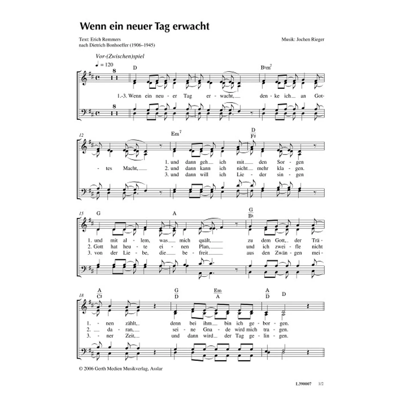 Wenn ein neuer Tag erwacht (diese Variante haben Sie gerade ausgewählt) (modern, gemischter Chor, mit Akkorden, vierstimmig, D-Dur) Erich Remmers (Text), Jochen Rieger (Komposition, Bearbeiter) |