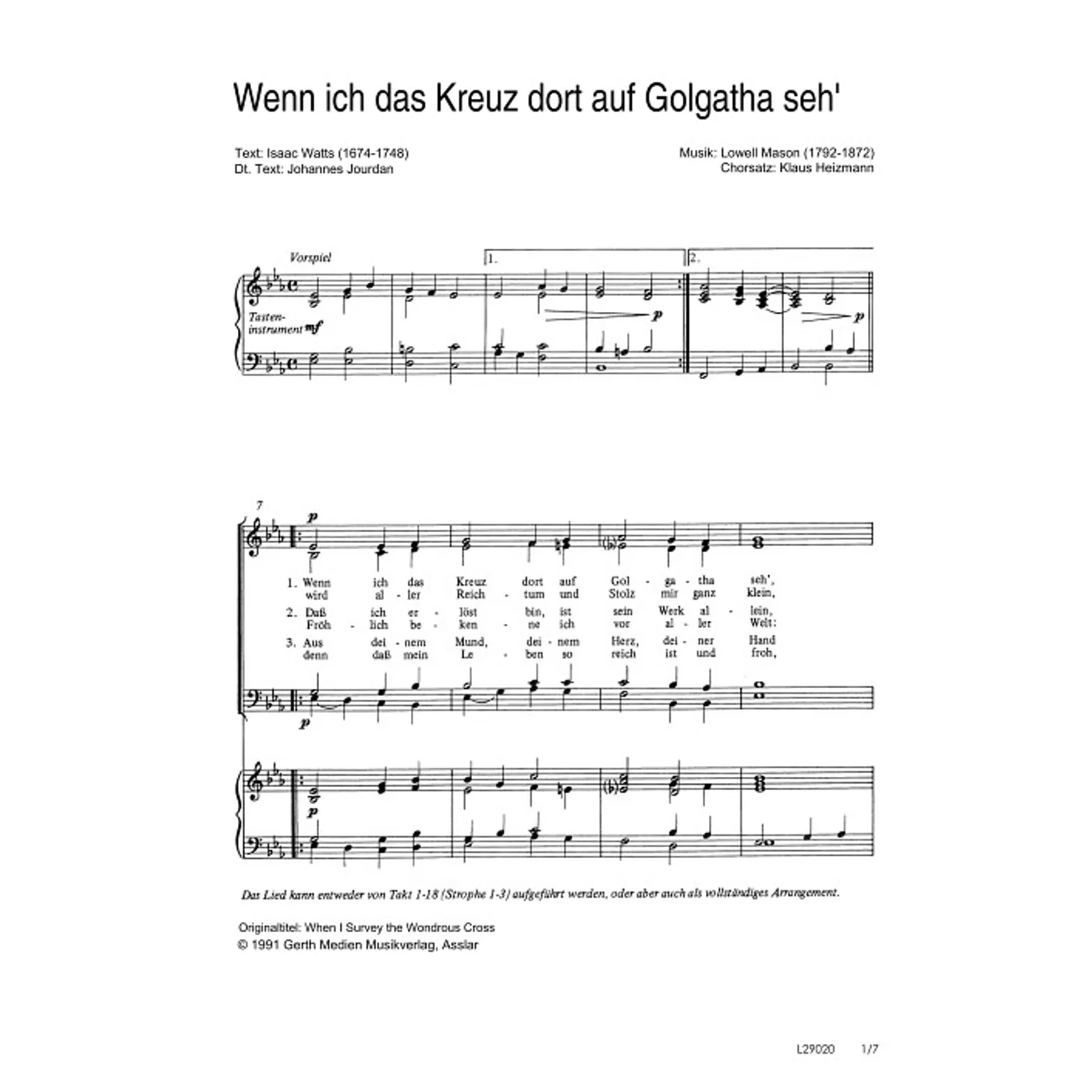 Wenn ich das Kreuz dort auf Golgatha seh (diese Variante haben Sie gerade ausgewählt) (traditionell, Klavier, gemischter Chor, vierstimmig) Isaak Watts (Text), Klaus Heizmann (Klaviersatz), Johannes Jourdan (Übersetzung) |