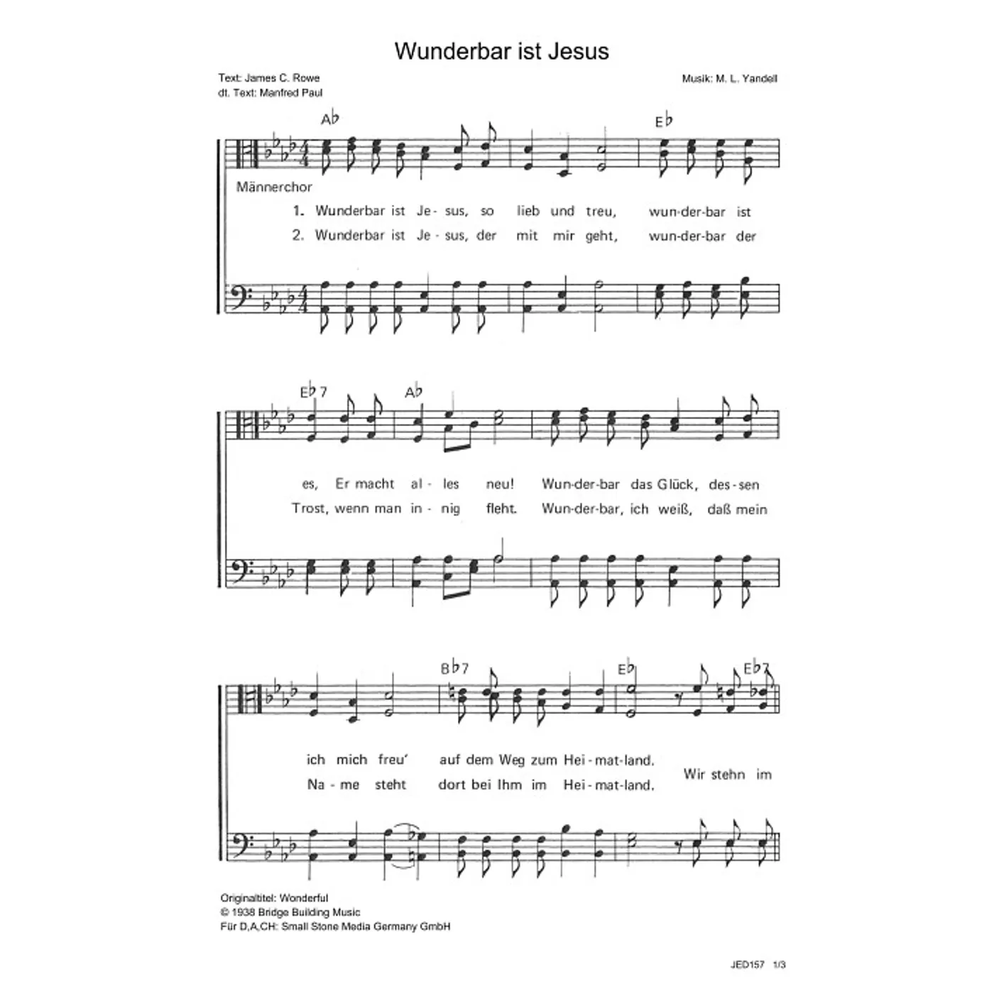 Dies ist ein Download-Artikel und kann nach dem Kauf digital heruntergeladen werden. Vorschau M. L. Yandell (Komposition) James C. Rowe (Text) Manfred Paul (Übersetzung) Wunderbar ist Jesus Männerchorsatz TTBB (Noten - Download) Bitte beachten Sie: Downloads sind aktuell nur in Deutschland erhältlich. Bitte wählen Sie aus, für wie viele Kopien/Ausdrucke Sie eine Lizenz erwerben möchten. Die Lizenz wird entsprechend auf dem Dokument vermerkt. 2,00 € Sofort Lieferbar (per Download) Günstige Mengenpreise verfügbar Günstige Mengenpreise (DE) Kaufen Sie 2 zum Preis von je 1,90 € und sparen Sie 5% Kaufen Sie 10 zum Preis von je 1,80 € und sparen Sie 10% Kaufen Sie 25 zum Preis von je 1,70 € und sparen Sie 15% Kaufen Sie 50 zum Preis von je 1,60 € und sparen Sie 20% Kaufen Sie 100 zum Preis von je 1,50 € und sparen Sie 25% Lizenz pro Kopie/Ausdruck: Bestellen Sie den Artikel jetzt auf: Informationen zur Lizenz Details Verlag: Small Stone Media Artikel-Nr.: W80027618 Originaltitel: Wonderful Tonart: As-Dur Stil/Genre: traditionell Satz: Männerchor, mit Akkorden, vierstimmig Seitenzahl: 3 S. Hinweise: DIN A4 Dateigröße insg.: 855,2 Kilobyte Dieses Produkt ist preisgebunden: Ja Download-Material: JED157 (PDF) Angaben zum Hersteller nach GPSR: Gerth Medien i.d. SCM Verlagsgruppe GmbH Berliner Ring 62 35576 Wetzlar DEUTSCHLAND info@scm-verlagsgruppe.de Weitere Details Weitere Varianten Noten-Downloads Wunderbar ist Jesus (diese Variante haben Sie gerade ausgewählt) (traditionell, Männerchor, mit Akkorden, vierstimmig, As-Dur) M. L. Yandell (Komposition), James C. Rowe (Text), Manfred Paul (Übersetzung) traditionell, Männerchor, mit Akkorden, vierstimmig, As-Dur 2,00 € Die Preise stellen die Einzelpreise der jeweils verfügbaren Einzeldownloads dar. Bewertungen Für dieses Produkt gibt es noch keine Rezensionen. Das könnte Sie auch interessieren zur Produktseite von Lob und Dank sei ihm Lob und Dank sei ihm Noten - Download 1,50 € Download zur Produktseite von Du großer Gott, wenn ich die Welt betrachte Du großer Gott, wenn ich die Welt betrachte Noten - Download 1,50 € Download zur Produktseite von Meine Seele ist stille in dir Meine Seele ist stille in dir Noten - Download 1,50 € Download zur Produktseite von Das Wort Gottes (Das Wort ist wie ein Lichtstrahl) Das Wort Gottes (Das Wort ist wie ein Lichtstrahl) Noten - Download 1,50 € Download zur Produktseite von Engel bringen frohe Kunde Engel bringen frohe Kunde Noten - Download 1,50 € Download zur Produktseite von Näher mein Gott zu dir Näher mein Gott zu dir Noten - Download 1,50 € Download zur Produktseite von Ich liebe nur Jesus Ich liebe nur Jesus Noten - Download 1,50 € Download