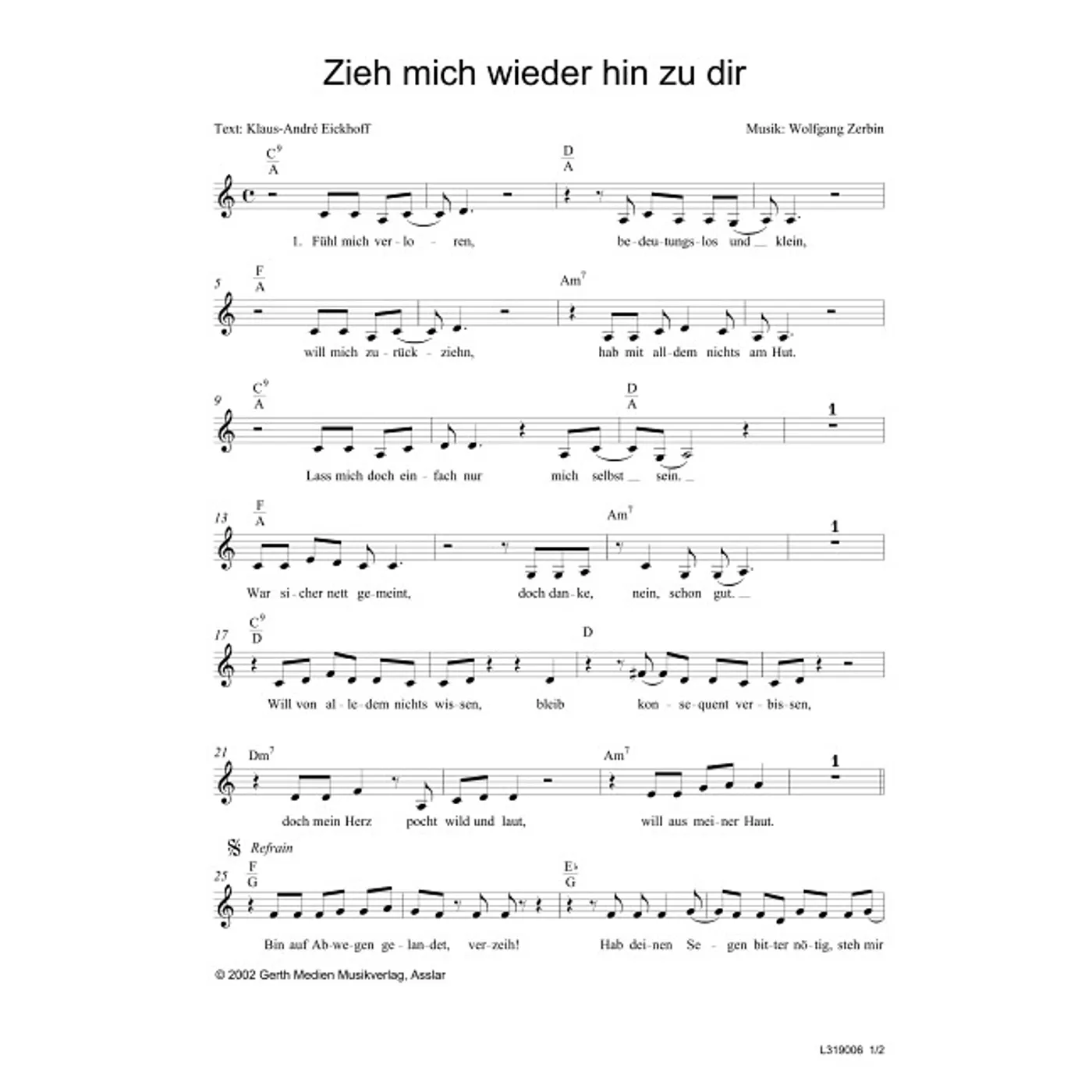 Zieh mich wieder hin zu dir (diese Variante haben Sie gerade ausgewählt) (einstimmig, mit Akkorden, C-Dur) Wolfgang Zerbin (Komposition), Klaus-André Eickhoff (Text) |